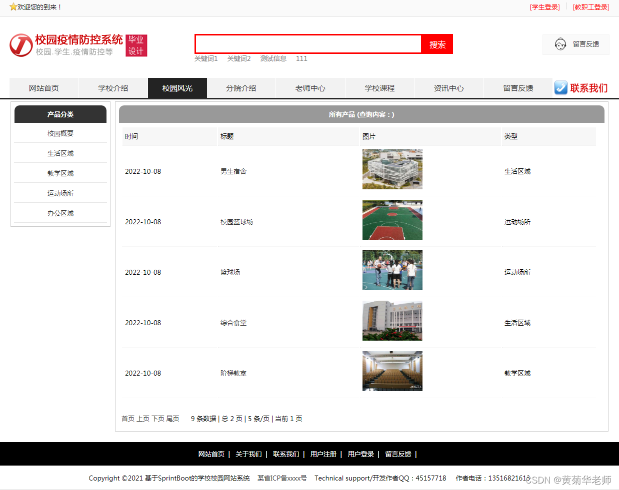 校园风光列表:显示所有校园风光,可以点击左侧校园风光分类筛选