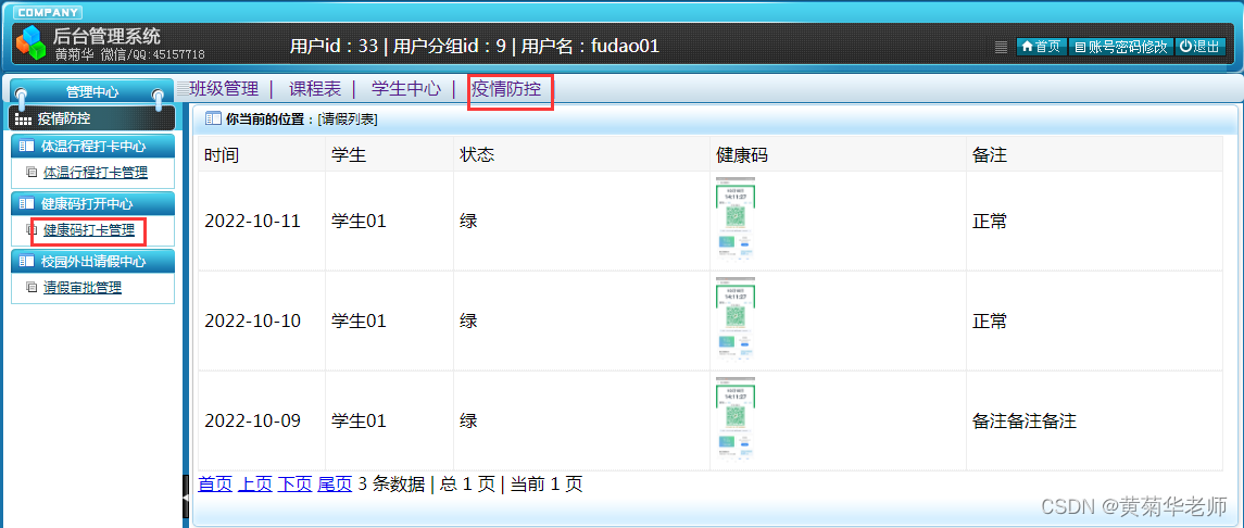 健康码列表:查看所属班级所有学生的健康码打卡记录