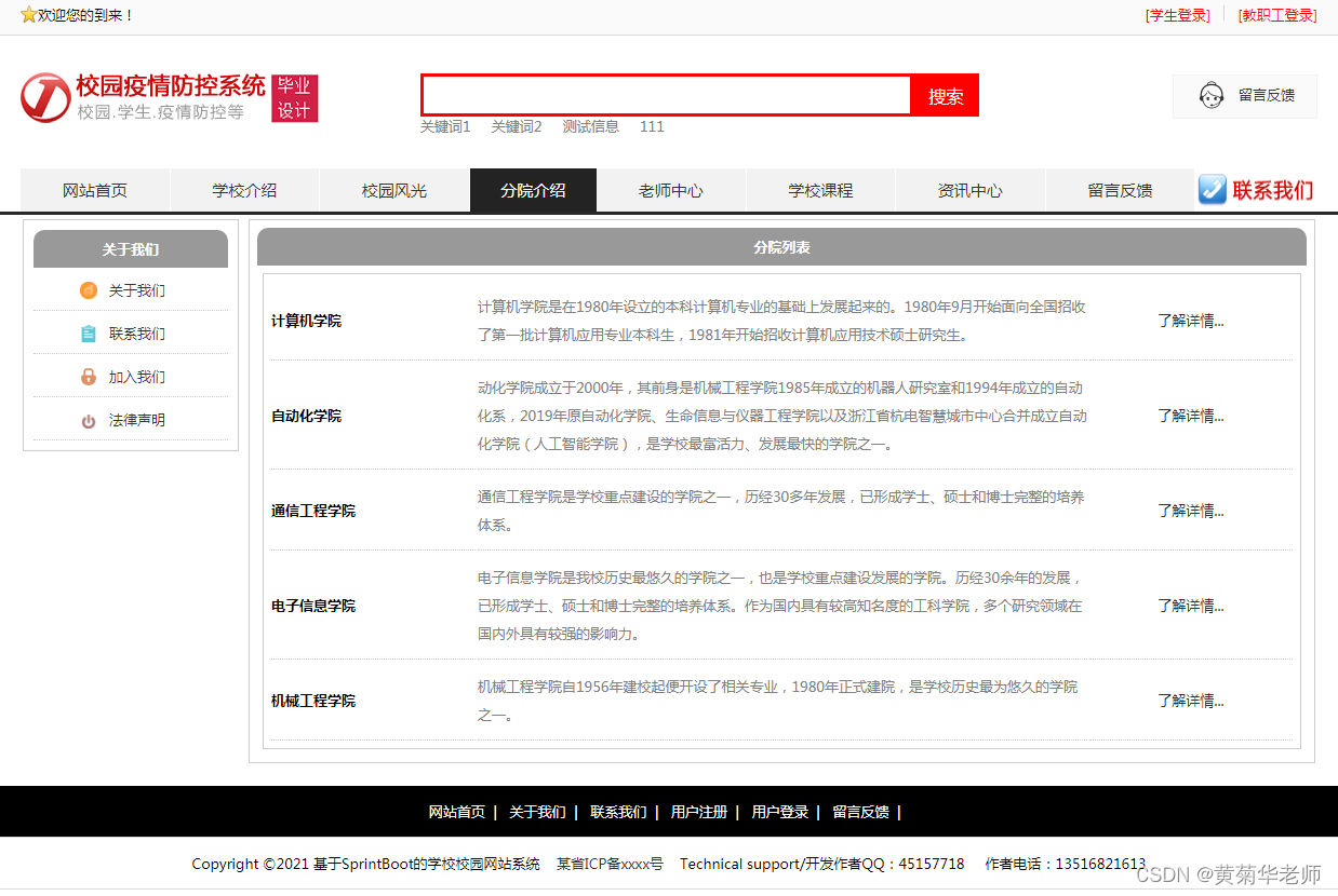 分院介绍:列出学校所有分院、可以点击查看详情查看