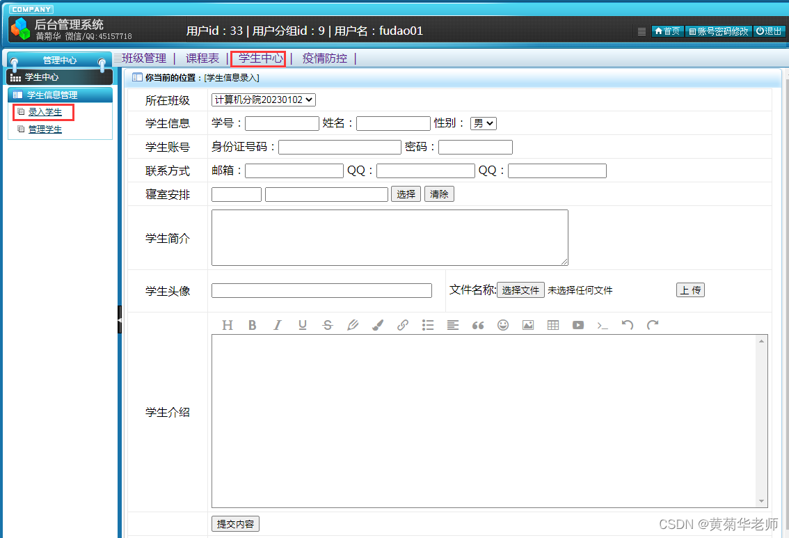 录入学生:选择班级、录入学生学好、账号、联系方式、新生安排等