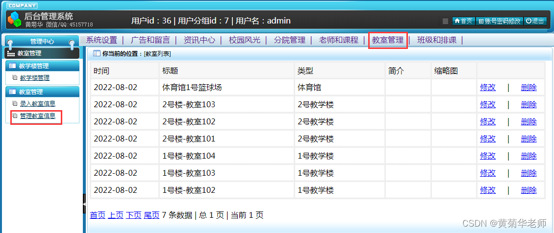 教室管理:管理已经录入教室,支持修改和删除
