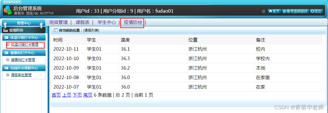 体温行程列表:查看所属班级所有学生的体温行程打卡记录