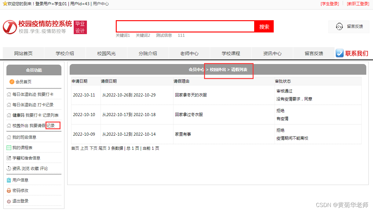 外出请假记录:自己发起的所有外出请假记录列表,同时显示老师审批结果