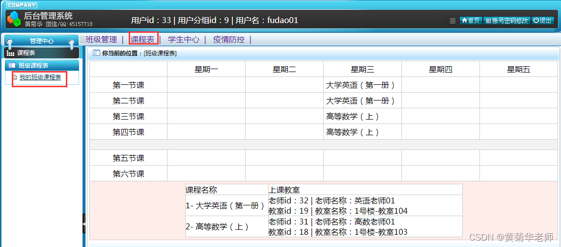 课程列表:显示管理的所有班级的课程列表