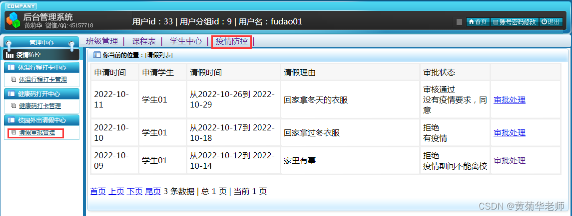 请假处理:针对学生请假审批,可以通过和拒绝