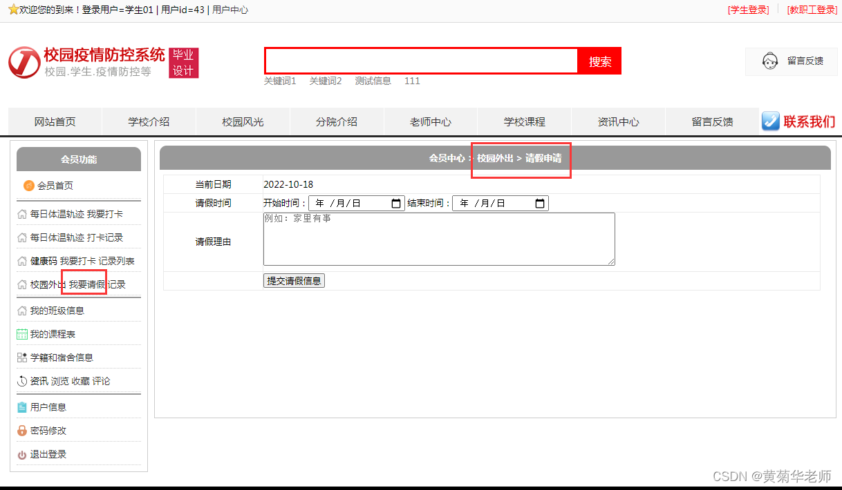 外出请假申请:录入请假日期,请假理由,向班主任发起审批
