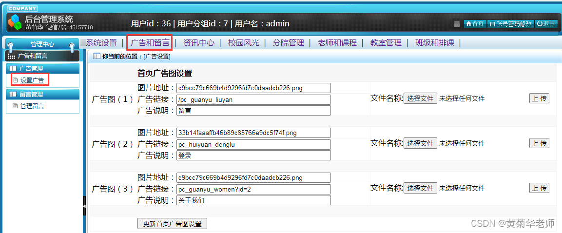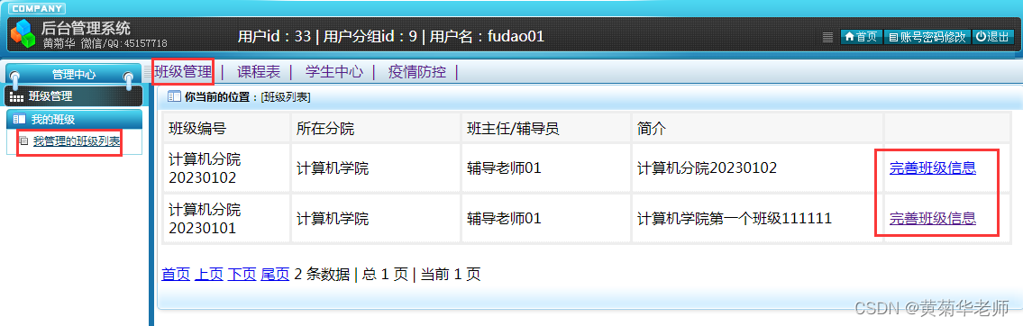 完善班级信息:班级信息由管理员初始化,班主任根据自己信息晚上