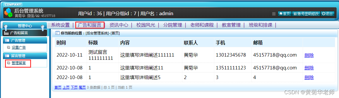 留言列表:所有用户留言信息列表,支持删除