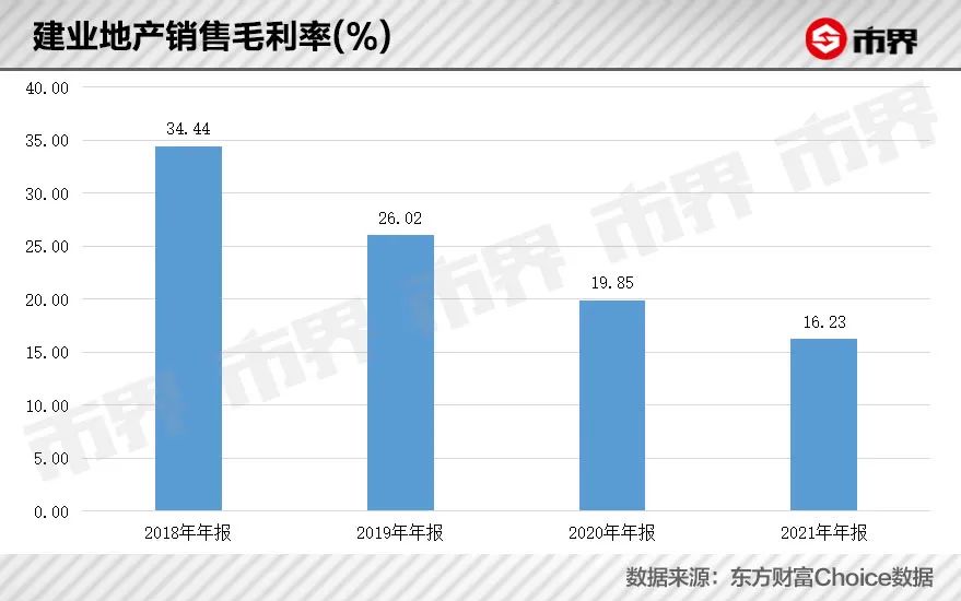 业绩不振背后,建业地产的毛利率已经较2018年的34.4%下滑了18.2%。对此建业地产称:“在积极采取促销政策后,建业地产毛利率较2020年下跌3.7个百分点至16.2%。”