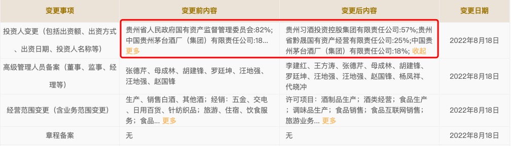 据国家企业信用信息公示系统,贵州茅台酒厂(集团)习酒有限责任公司(简称“习酒集团”)股权近日再度发生变更,原本由贵州省国资委持股82%的股权,变更为习酒投资集团持股57%,黔晟国资持股25%。