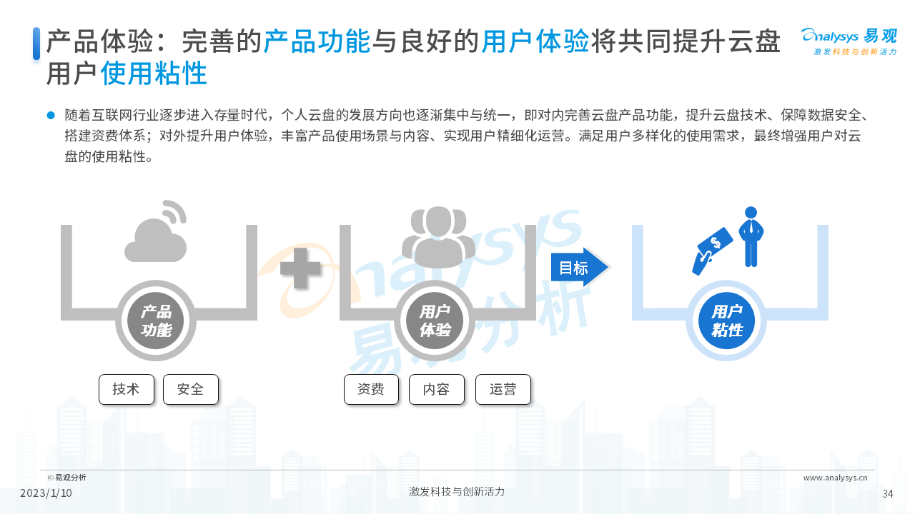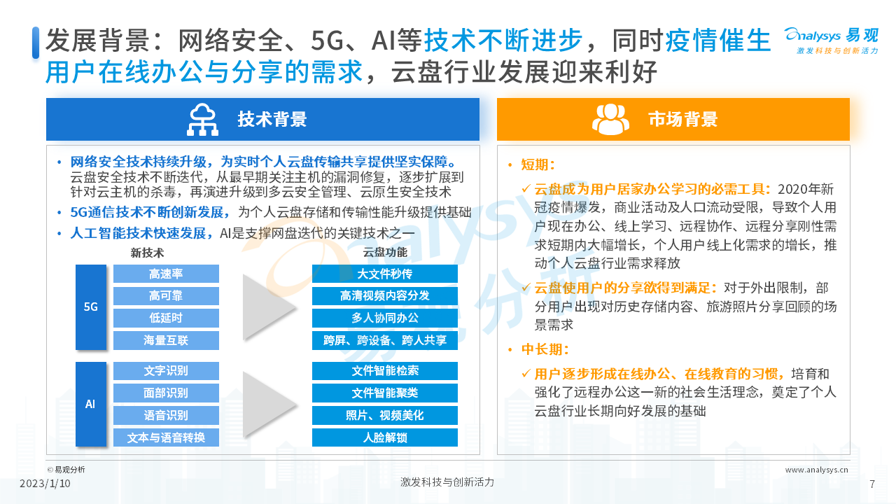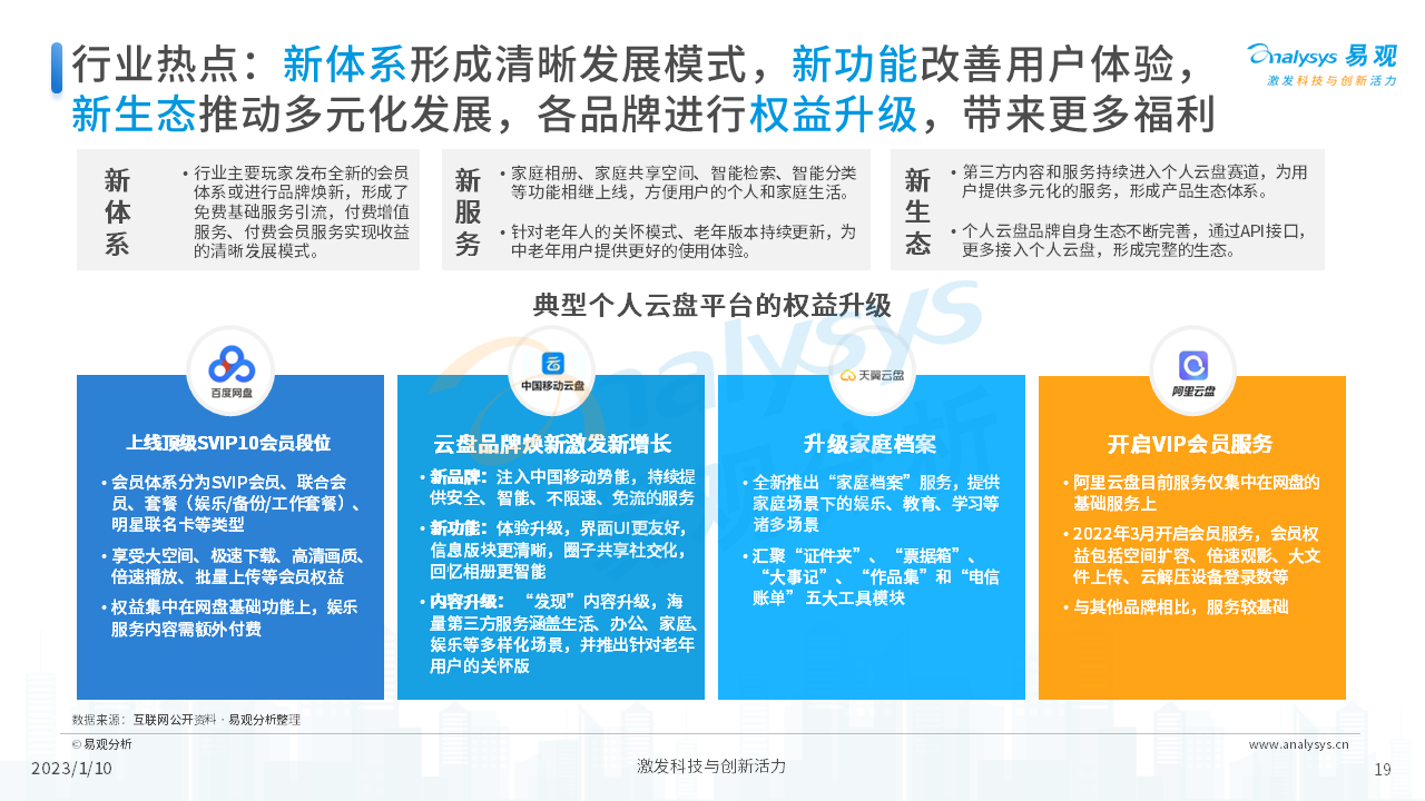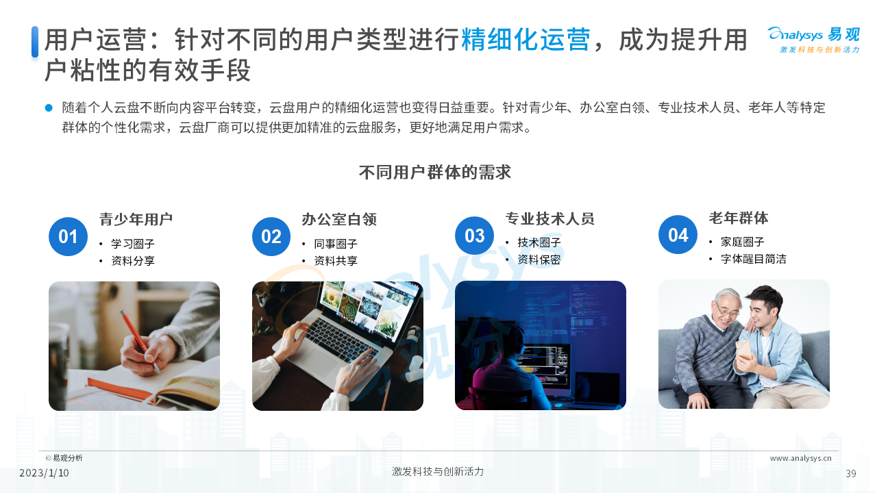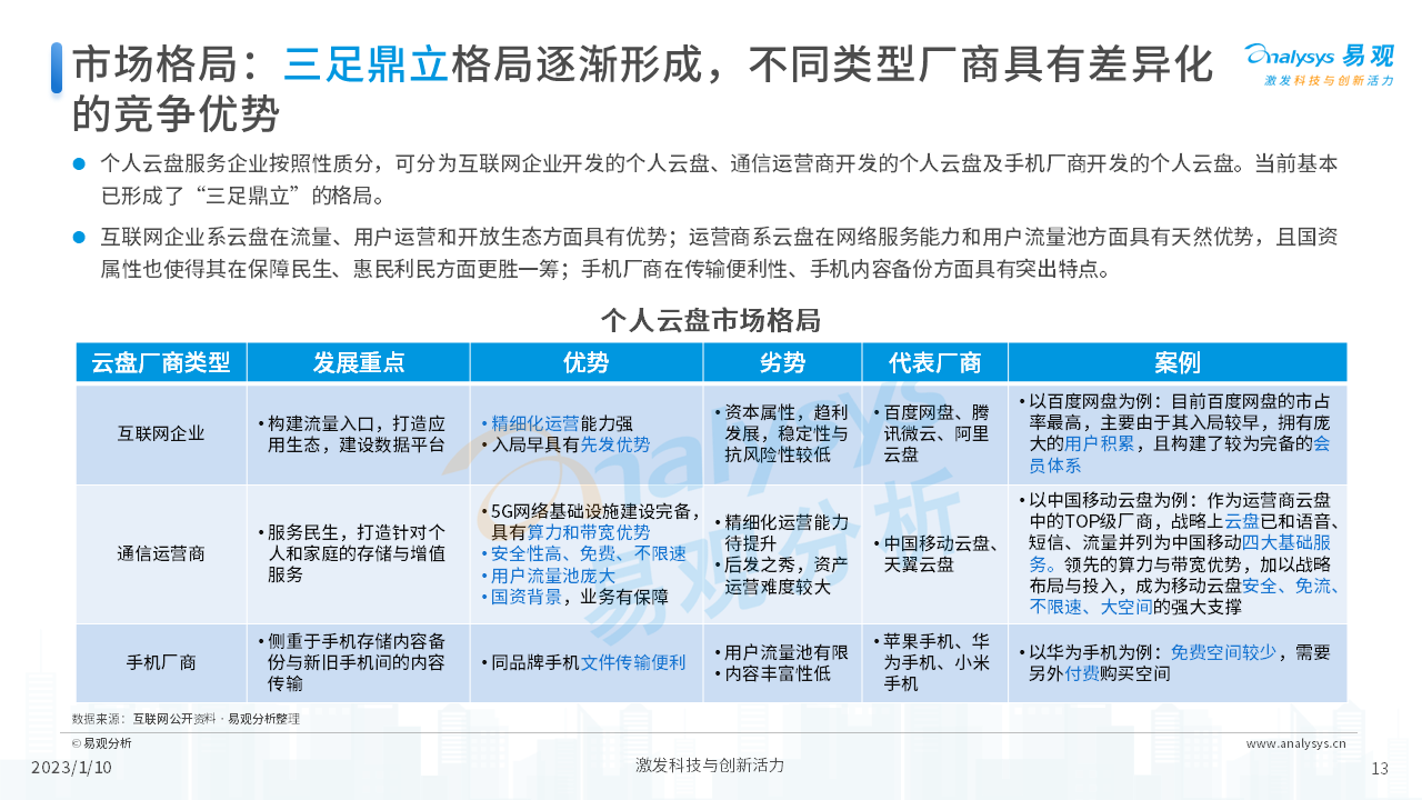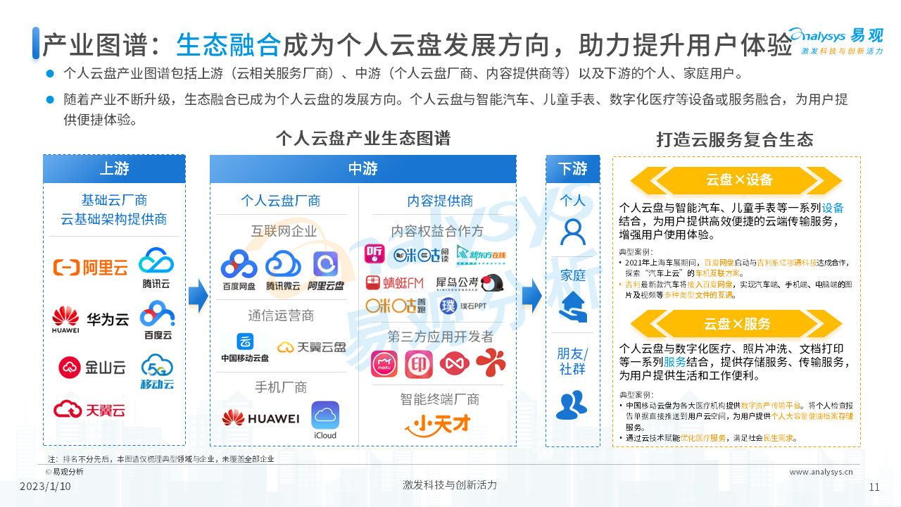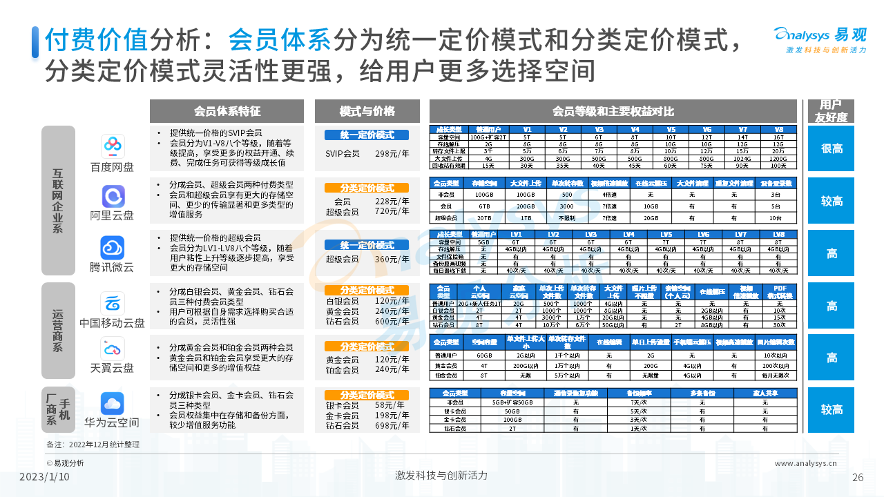 个人云盘行业当前处于规范化发展阶段,在政策、技术、需求红利牵引下,行业发展空间巨大。个人云盘已从单一存储工具发展为数字资产的主要承载,逐步发展成综合化、生态化的平台,打造个人云上生活的入口。报告主要分析中国个人云盘行业的宏观环境、行业竞争格局,对比云盘厂商的产品实力,预测中国个人云盘市场的发展趋势。报告指出产品发展应从产品价值与用户体验两个方向提升。产品价值方面,一是持续提升技术能力,提供高可用、低时延、速度快的产品性能,提高AI效能。二是切实做好数据安全工作,落实数据传输、存储安全。用户体验方面,一是提供更灵活的资费体系,实现更自由的会员体系、权益体系、通信套餐组合。二是持续API开放,输入内容能力,丰富内容生态,联合生态厂商,输出云盘的能力,构建特定场景下的解决方案。三是深耕精细化运营,提供青少年、办公室白领、专业技术人员、老年人等特定群体靶向功能覆盖。