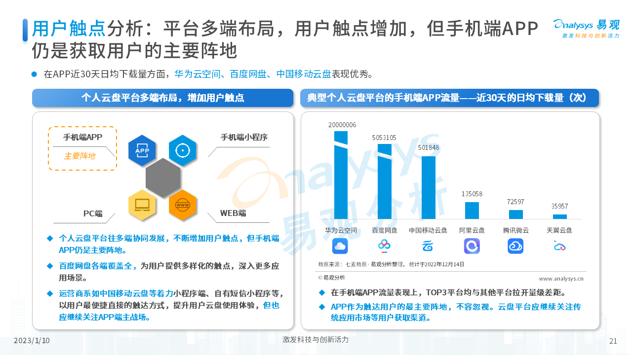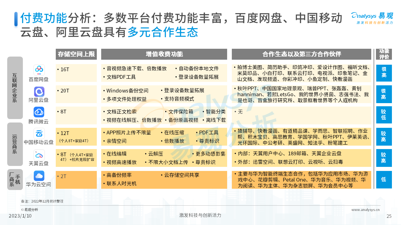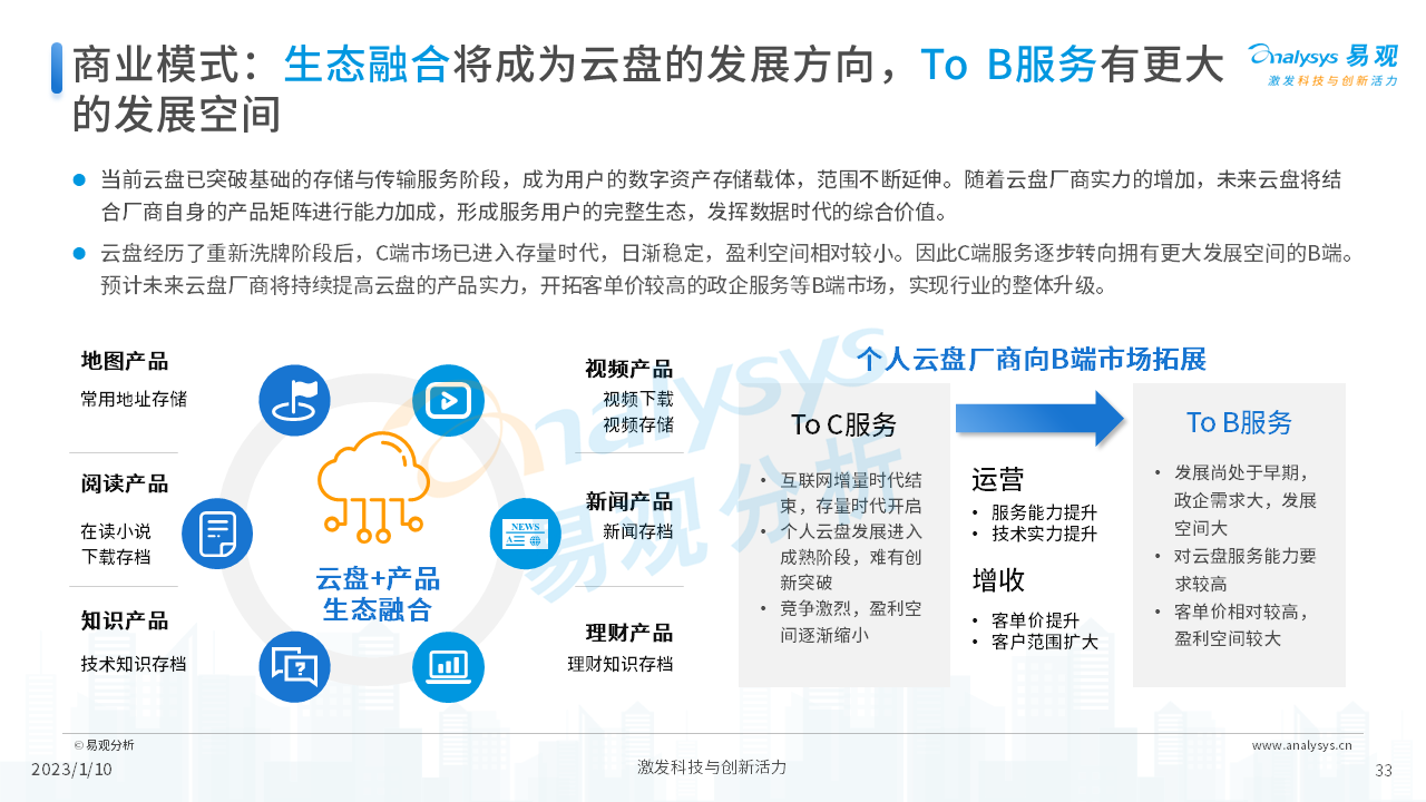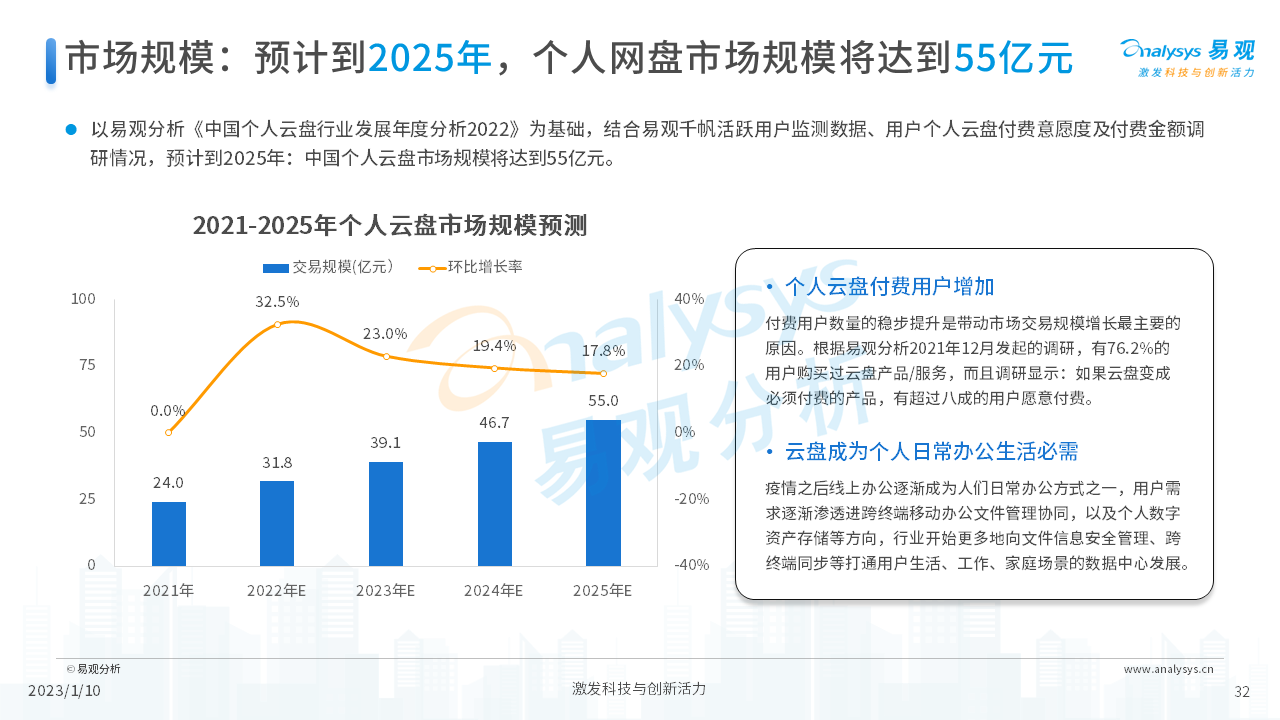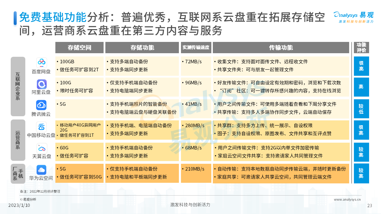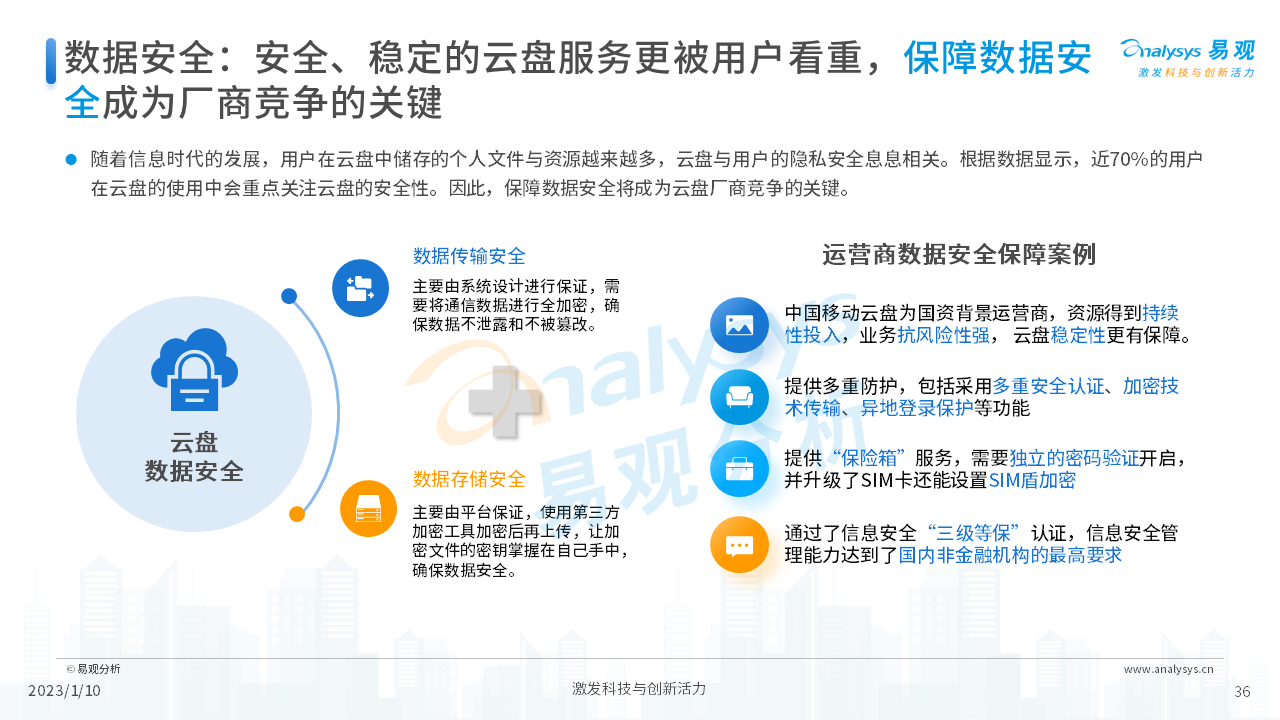 个人云盘行业当前处于规范化发展阶段,在政策、技术、需求红利牵引下,行业发展空间巨大。个人云盘已从单一存储工具发展为数字资产的主要承载,逐步发展成综合化、生态化的平台,打造个人云上生活的入口。报告主要分析中国个人云盘行业的宏观环境、行业竞争格局,对比云盘厂商的产品实力,预测中国个人云盘市场的发展趋势。报告指出产品发展应从产品价值与用户体验两个方向提升。产品价值方面,一是持续提升技术能力,提供高可用、低时延、速度快的产品性能,提高AI效能。二是切实做好数据安全工作,落实数据传输、存储安全。用户体验方面,一是提供更灵活的资费体系,实现更自由的会员体系、权益体系、通信套餐组合。二是持续API开放,输入内容能力,丰富内容生态,联合生态厂商,输出云盘的能力,构建特定场景下的解决方案。三是深耕精细化运营,提供青少年、办公室白领、专业技术人员、老年人等特定群体靶向功能覆盖。