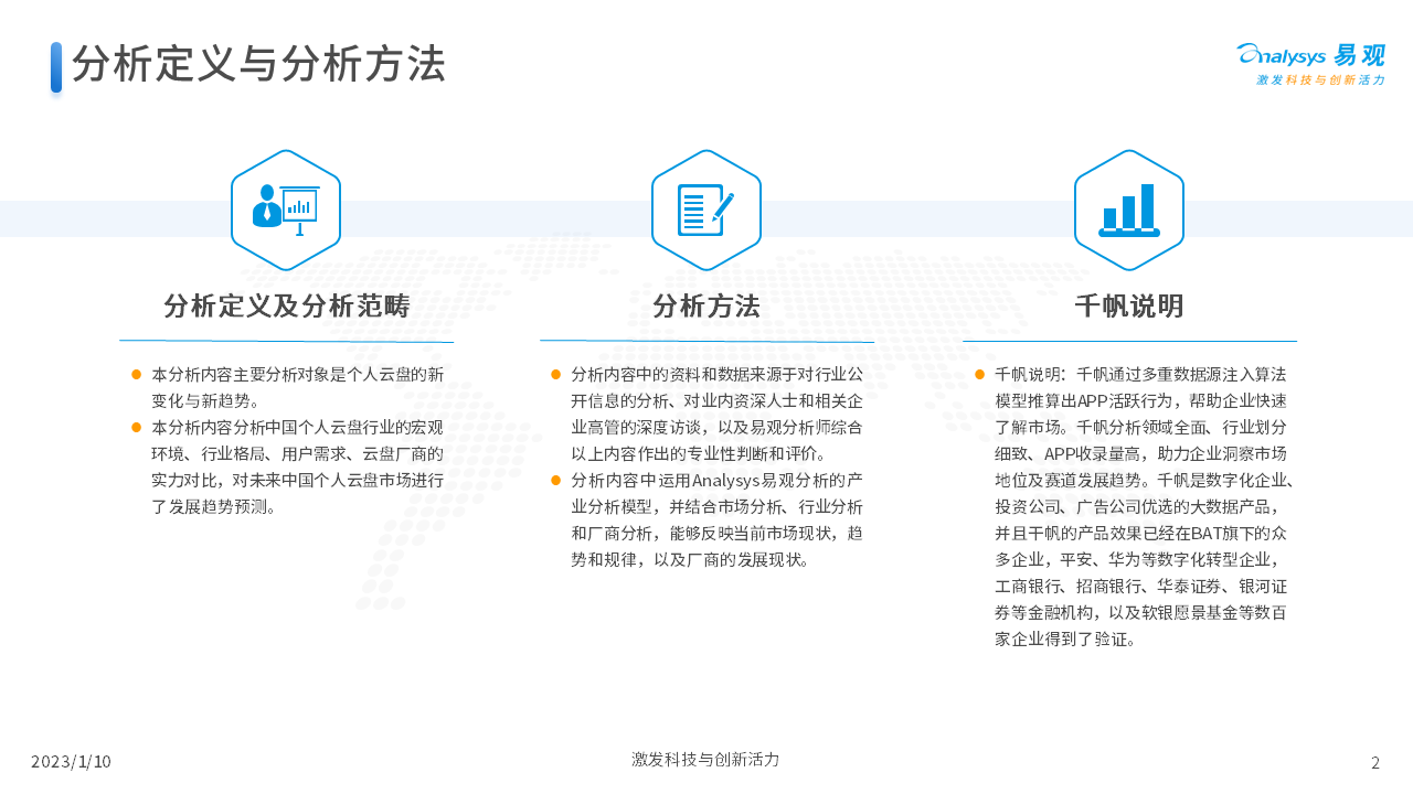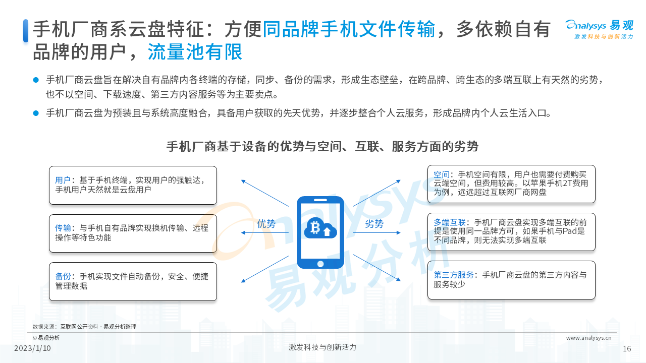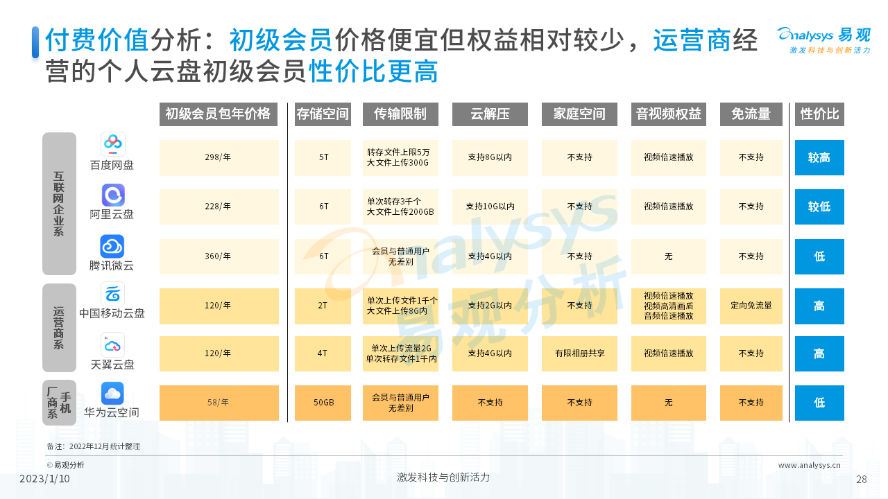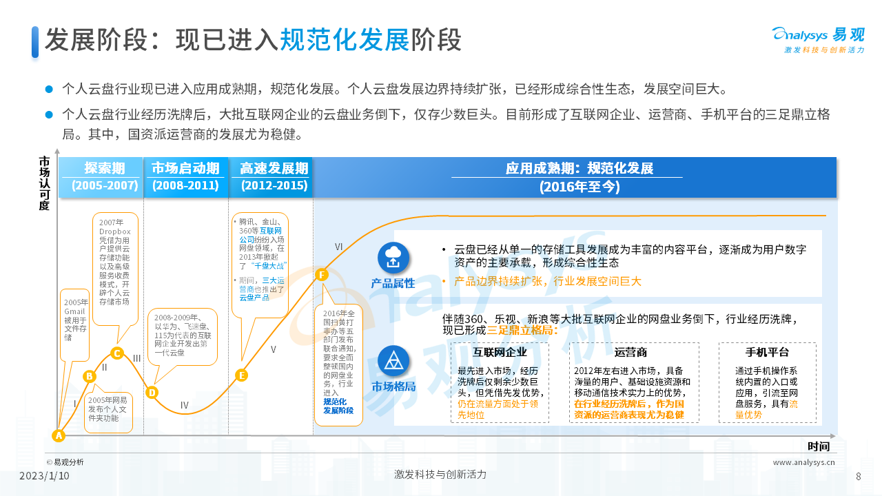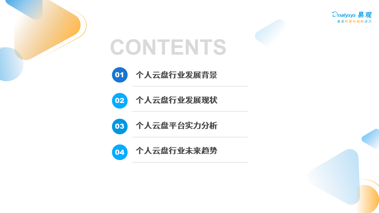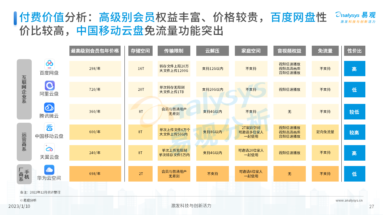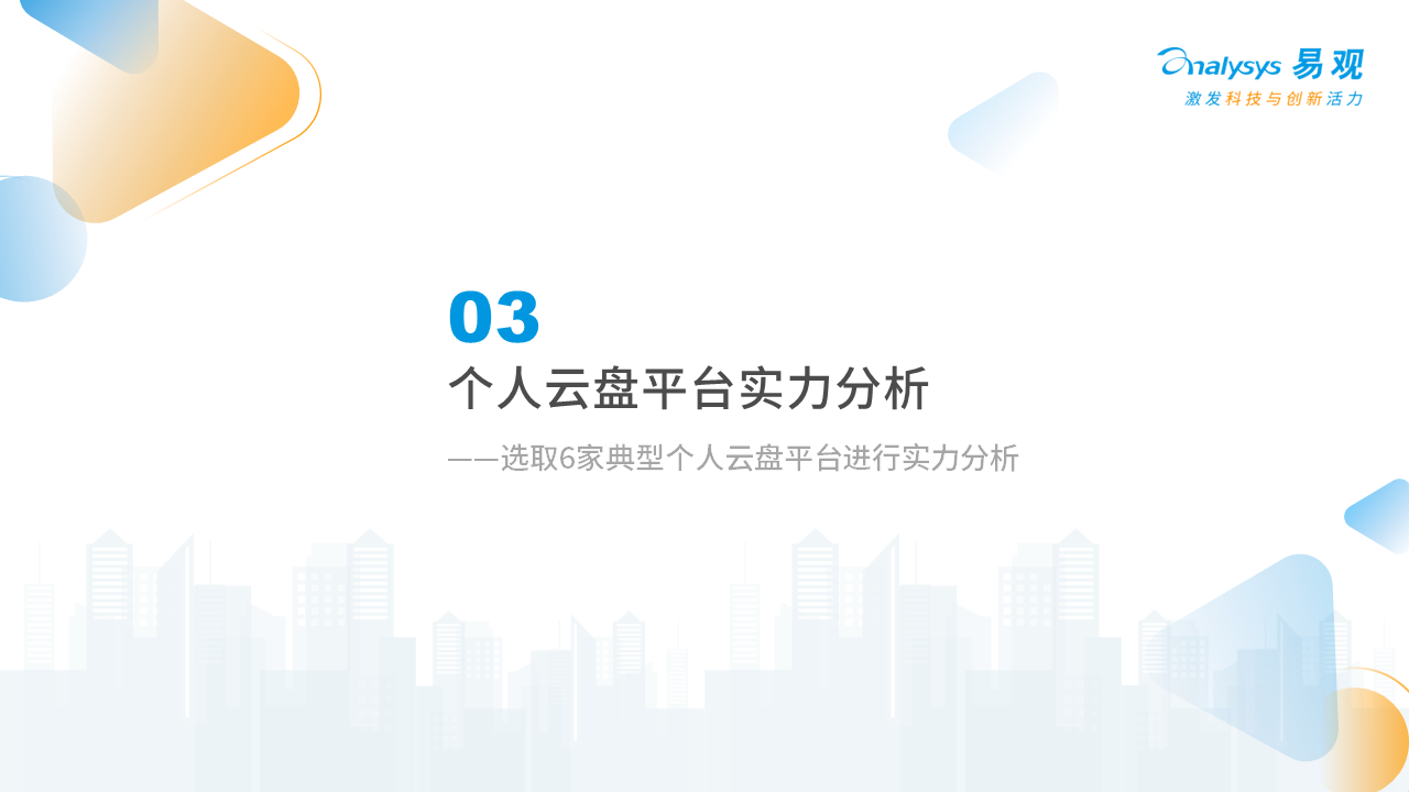 个人云盘行业当前处于规范化发展阶段,在政策、技术、需求红利牵引下,行业发展空间巨大。个人云盘已从单一存储工具发展为数字资产的主要承载,逐步发展成综合化、生态化的平台,打造个人云上生活的入口。报告主要分析中国个人云盘行业的宏观环境、行业竞争格局,对比云盘厂商的产品实力,预测中国个人云盘市场的发展趋势。报告指出产品发展应从产品价值与用户体验两个方向提升。产品价值方面,一是持续提升技术能力,提供高可用、低时延、速度快的产品性能,提高AI效能。二是切实做好数据安全工作,落实数据传输、存储安全。用户体验方面,一是提供更灵活的资费体系,实现更自由的会员体系、权益体系、通信套餐组合。二是持续API开放,输入内容能力,丰富内容生态,联合生态厂商,输出云盘的能力,构建特定场景下的解决方案。三是深耕精细化运营,提供青少年、办公室白领、专业技术人员、老年人等特定群体靶向功能覆盖。