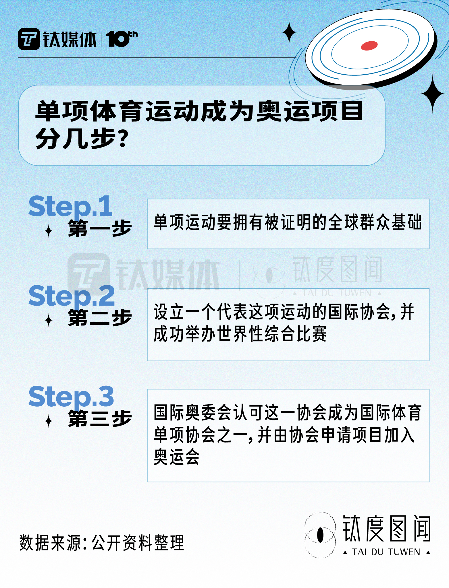 目前,飞盘运动正在申请进入全球最顶级赛事——夏季奥运会。从奥运会进驻一般流程来看,飞盘的“奥运梦”只差“临门一脚”。 据钛媒体·钛度图闻公开资料整理,单项体育运动成为奥运会项目,主要分三步。