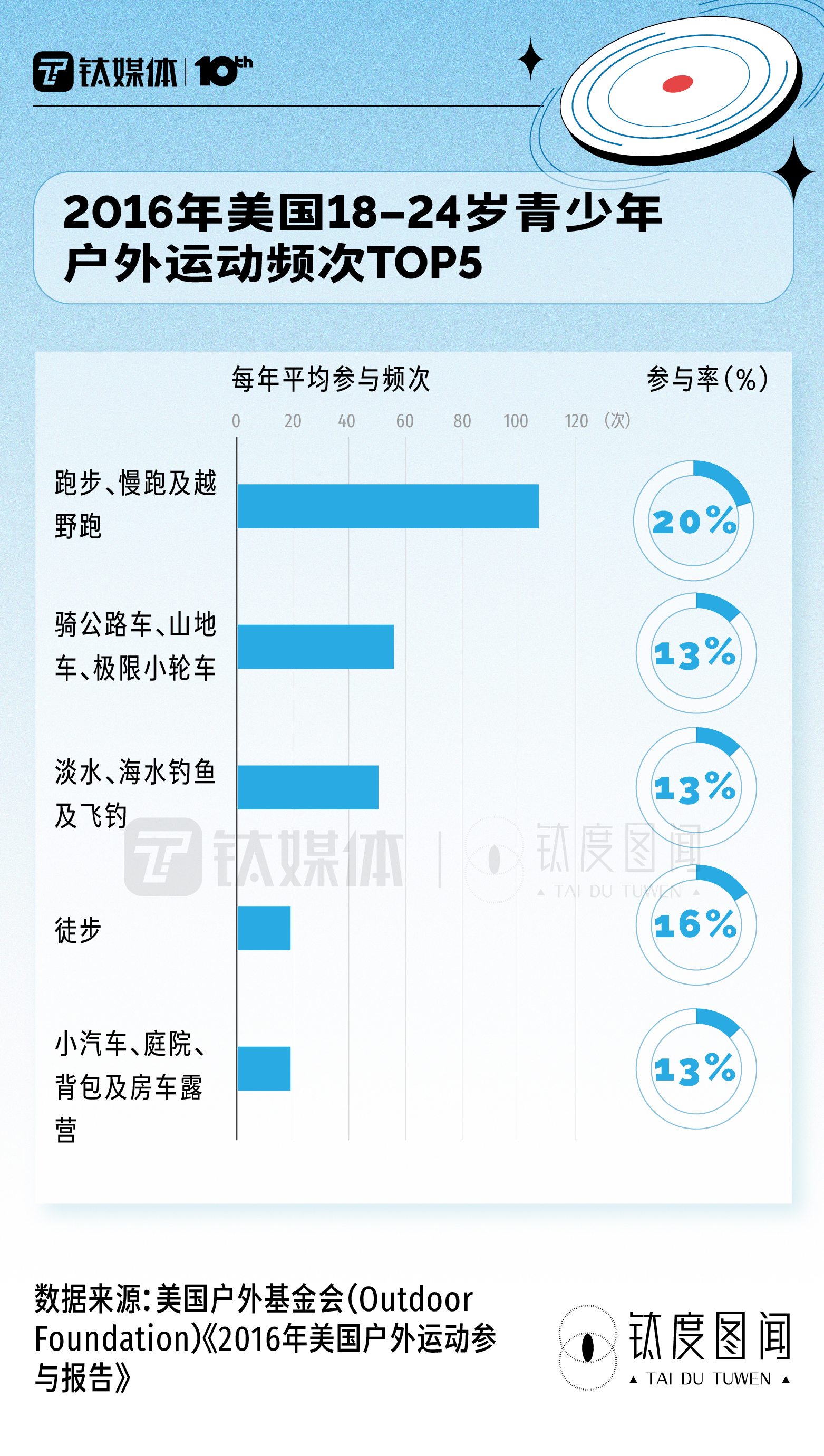 据美国户外基金会(Outdoor Foundation)的《2016年美国户外运动参与报告》,从户外运动参与频次来看,18-24岁青少年最喜欢的是“跑步、慢跑及越野跑”,参与频次有9.463亿次(每位跑者平均每年107次),其次是“骑公路车、山地车、极限小轮车”(共计2.284亿次)、“淡水、海水钓鱼及飞钓”(共计2.039亿次)。“徒步”“小汽车、庭院、背包及房车露营”分别排在第4位、第5位。相比较而言,“飞盘”项目并未进入TOP5。
