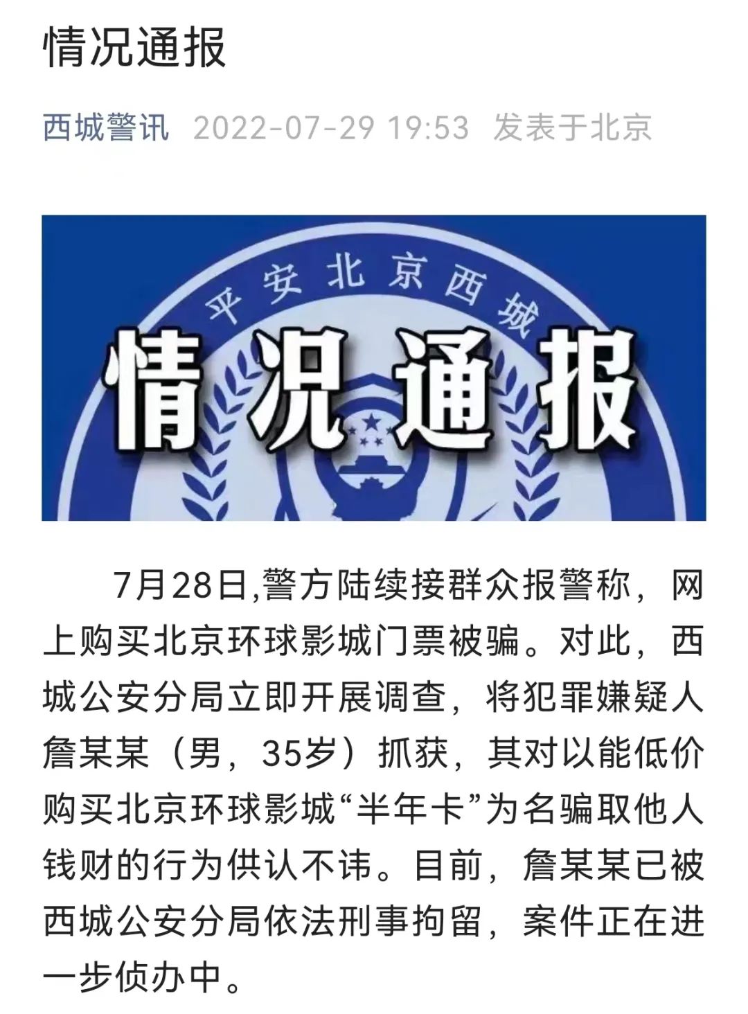 7月29日晚,北京西城警讯也发布了通报:“7月28日,警方陆续接群众报警称,网上购买北京环球度假区门票被骗。对此,西城公安分局立即开展调查,将犯罪嫌疑人詹某某(男,35岁)抓获,其对以能低价购买北京环球度假区‘半年卡’为名骗取他人钱财的行为供认不讳。目前,詹某某已被西城公安分局依法刑事拘留,案件正在进一步侦办中。”