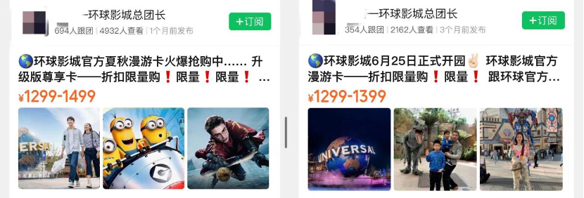 被骗的不止陈琪的团。7月28日晚开始,微博、小红书等社交平台上陆续有团长表示自己被一个叫詹某某的人骗了,对方自称是与环球有合作的渠道商,能够以低于600元的价格预售环球漫游卡。由于许多团长曾经与詹某某有过合作,从詹某某手里成功买过大量环球特价单日票,所以陆续从詹某某手里囤了大量漫游卡,并以官方正式售价的5~8折开团售卖。