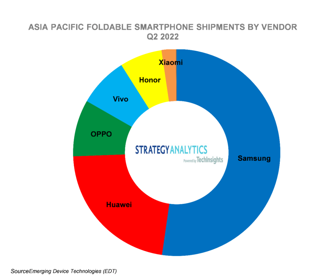 聚焦到亚太折叠屏手机市场,根据Strategy Analytics数据显示,排名前五的顺序分别是三星、华为、OPPO、vivo、荣耀。