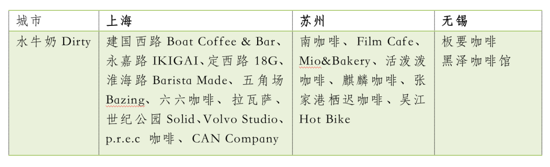 (以上海、苏州、无锡部分独立咖啡馆为例,他们都在菜单中主推过水牛奶Dirty,Manner也在部分门店上新过水牛奶Dirty,这些试水某种程度上加速了咖啡中使用水牛奶的认知普及和用户端接受程度,并提高了相关水牛奶品牌的知名度。BBB研究所根据大众点评信息做不完全统计)
