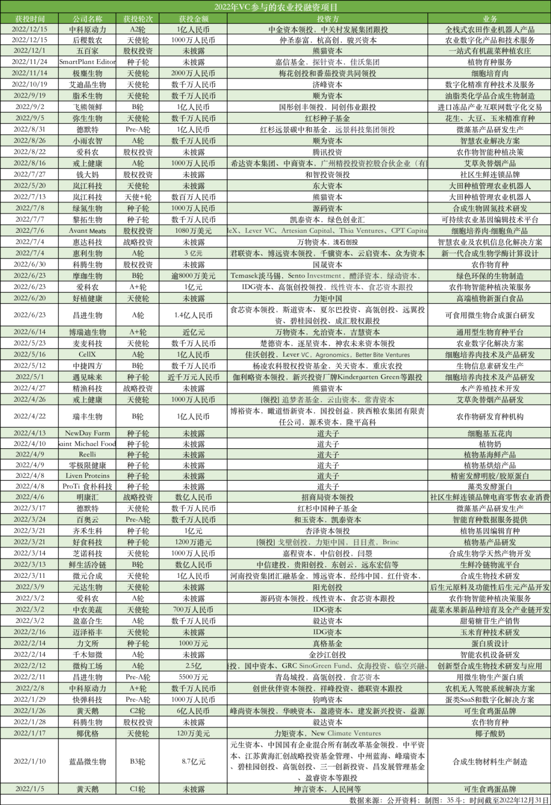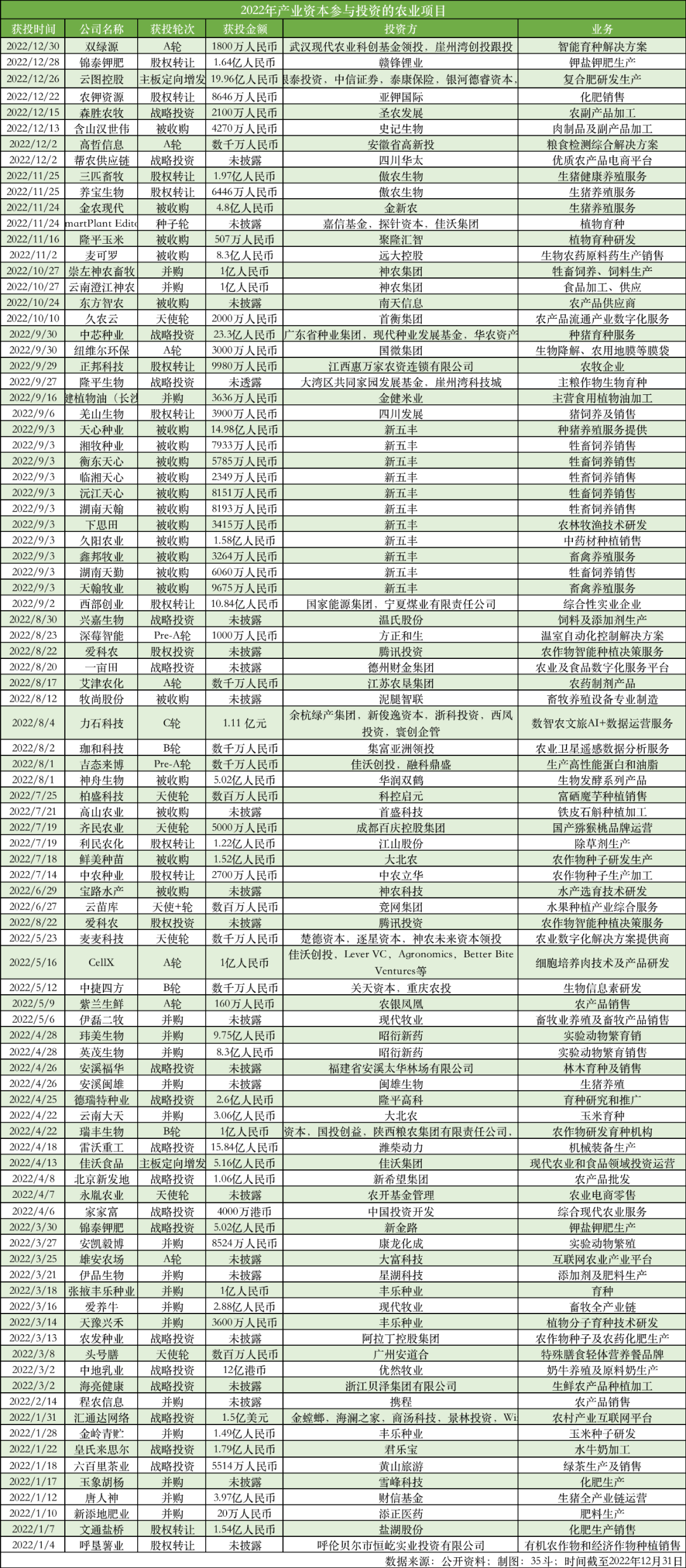 需要说明的是,35斗关注政策和技术驱动下的大农业产业变革,统计的农业类公司主要覆盖农业产业链中上游阶段,即从上游农业投入品到中游生产加工及运输的供应链环节,覆盖种药肥、种植、畜牧业、水产渔业、智能农机等领域,以及尚在发展的新产业,比如植物蛋白、细胞肉类项目等,但不包含餐饮类、酒类项目。