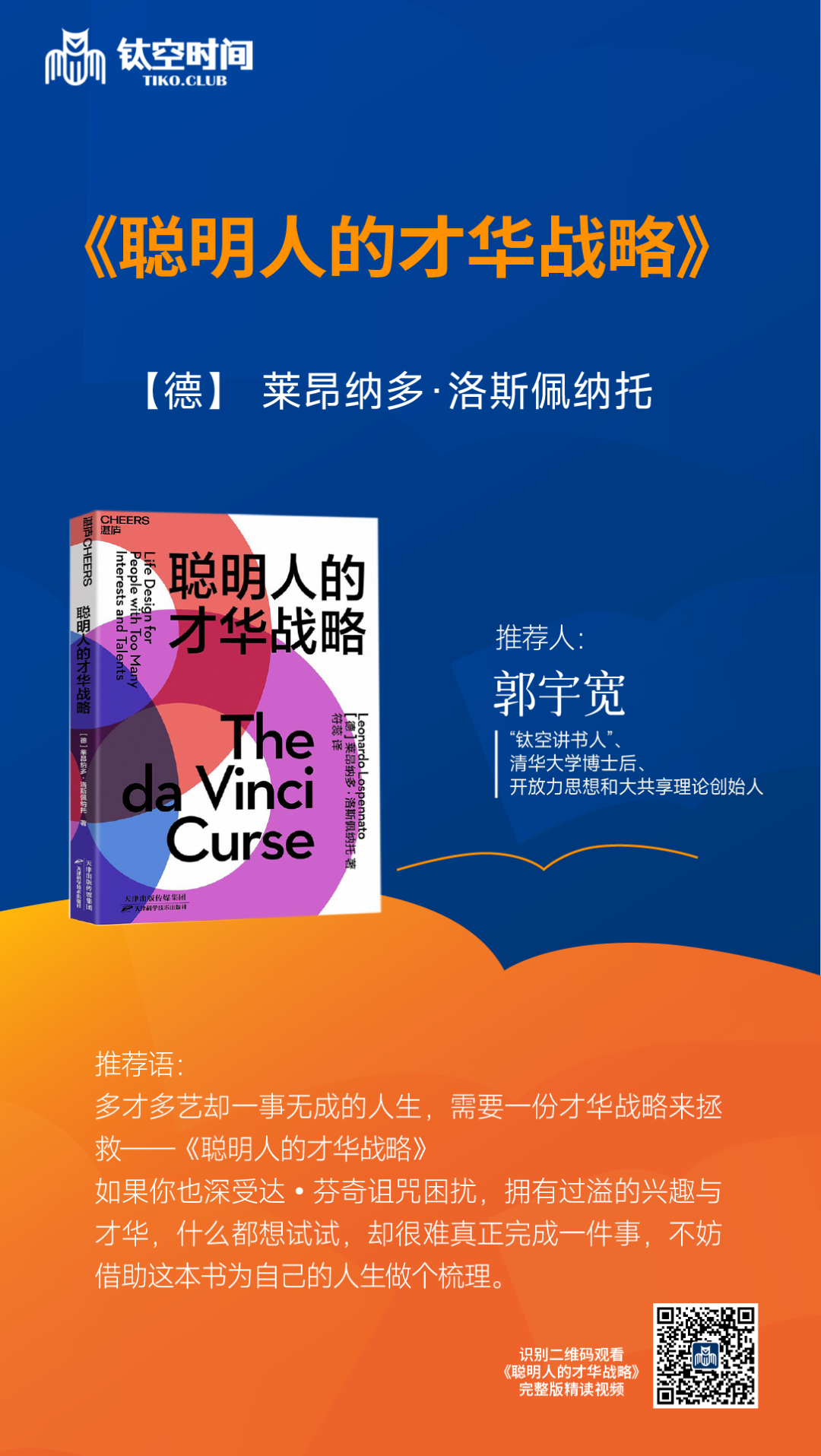 那这个支点是什么呢?这个纳瓦尔说了,他说有一件事你一定要做,比如做自己,但是这话说回来了,人要认识自己是什么,就是说你你就找到一个人活了 80 岁,你给我讲你是谁,这问题太哲学了,这问题真不好回答,这怎么叫做自己?那心理学上讲,人的性格有多少个维度,多少个侧面,这怎么叫做做自己?这个是要有相当大的学问,所以我就看到这,我就觉得纳瓦尔宝典这本书缺了一章,就是怎么做自己,特别是如果一个人我天生就是才华和兴趣就比较多,那我怎么做自己?我怎么能够在市场里面把我的优势发挥出来?我就想到我前一段时间也做成了课程跟大家推荐的一本书,这本书就叫做《聪明人的才华战略》它的英文标题注释叫做达芬奇的诅咒。