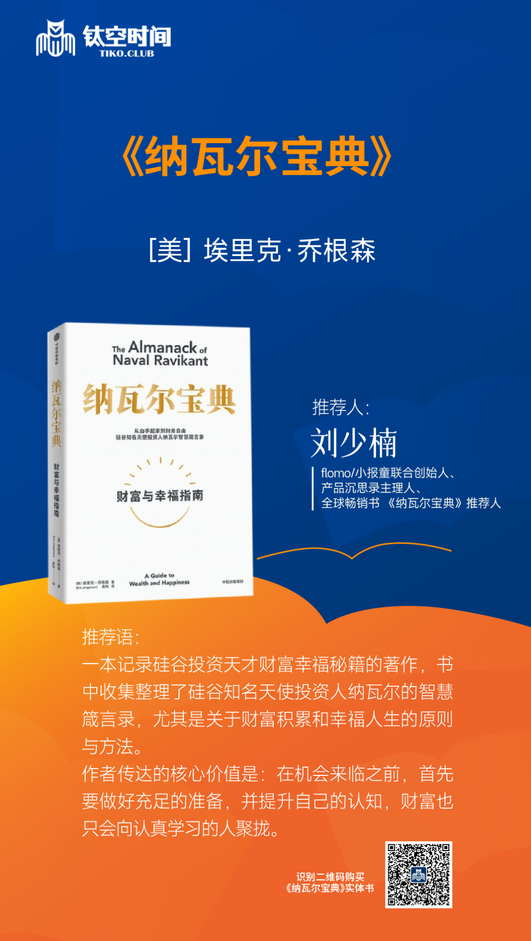那么他的这个人生经历和他的产品思路就是体现了这本《纳瓦尔宝典》里的,这本书里面讲的财富自由,和我们普通理解的“挥金如土”的财富不是一回事,具体的推荐,我们今天也邀请到了,著名的互联网产品经理flomo的联合创始人刘少楠老师和我们一起来品鉴一下这本书。