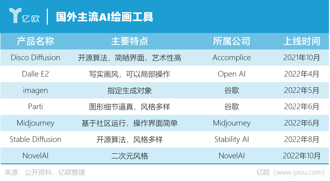 亿欧整理发现,目前国外主流的AI绘画工具各有千秋:有些工具是完全开源免费的算法模型,就像手机界的安卓系统,可以让其他人进行二次开发;有些工具基于社区运行,不但操作门槛低,还可以共享Prompt,创作氛围良好;有些工具则在图像类型和细节上有独一无二的优势。