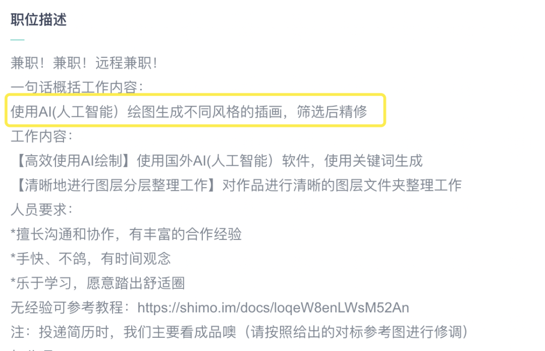 之前在某招聘平台上甚至已经出现不要求绘画能力的插画师岗位,其工作内容是“使用AI(人工智能)绘图生成不同风格的插画,筛选后精修”,被网友吐槽是在给AI打下手。
