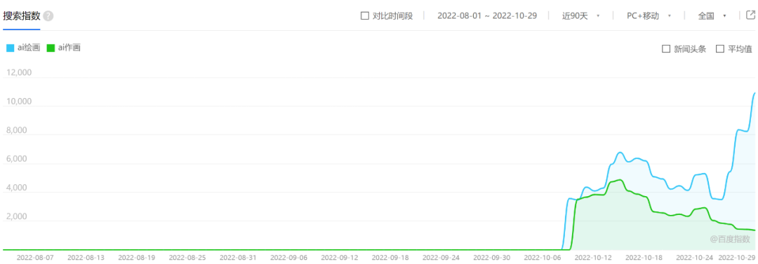 刚刚过去的10月,一大波由AI创造的画作攻陷了网络社交平台。在B站、小红书等软件搜索“AI绘画”关键词,相关的作品展示、技术分享及话题讨论随处可见。根据百度搜索指数,这股热潮还在震荡上升中。