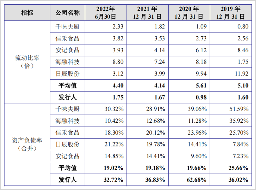 相对于同业,德馨食品负债率较高,且负债质量令人堪忧。