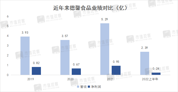 2019年到2021年德馨食品营收从3.93亿增长到5.29亿,增幅达34.61%。净利润仅从0.8亿增长至0.95亿,增幅为18.75%,远低于营收增速。