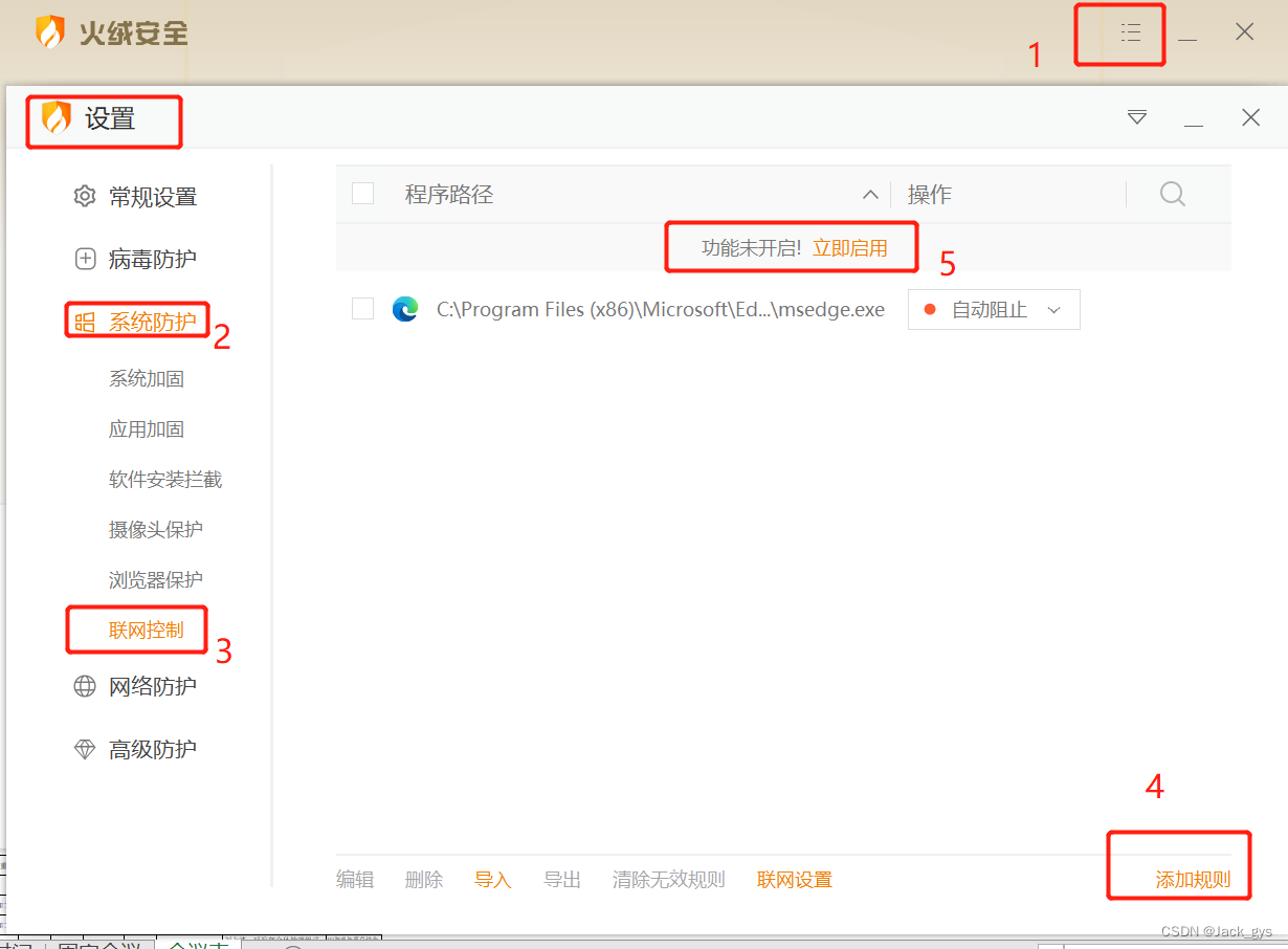 1、打开安全设置---系统防护---联网控制---添加规则(随便选择一条添加,添加首条规则后,才会出现功能开启开关)---立即启用