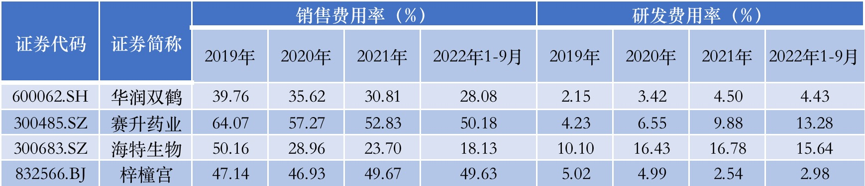(梓橦宫与同行销售费用率、研发费用率对比,数据来源:wind)