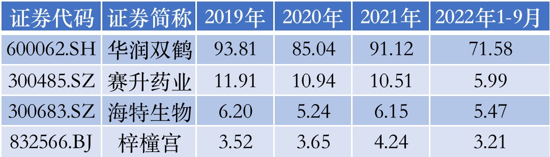 而2019年-2021年、2022年1-9月,华润双鹤(600062.SH)营收为93.81亿元、85.04亿元、91.12亿元和71.58亿元,赛升药业(300485.SZ)营收为11.91亿元、10.94亿元,海特生物(300683.SZ)营收为6.20亿元、5.24亿元、6.15亿元和5.47亿元。