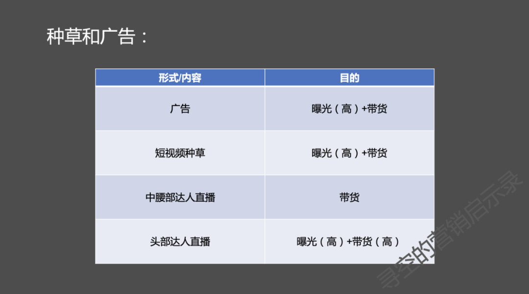 内容带货就是种草,它与广告的目标一样,一是曝光,二是销售,不过如上文所说,种草的带货转化时间远快于广告。