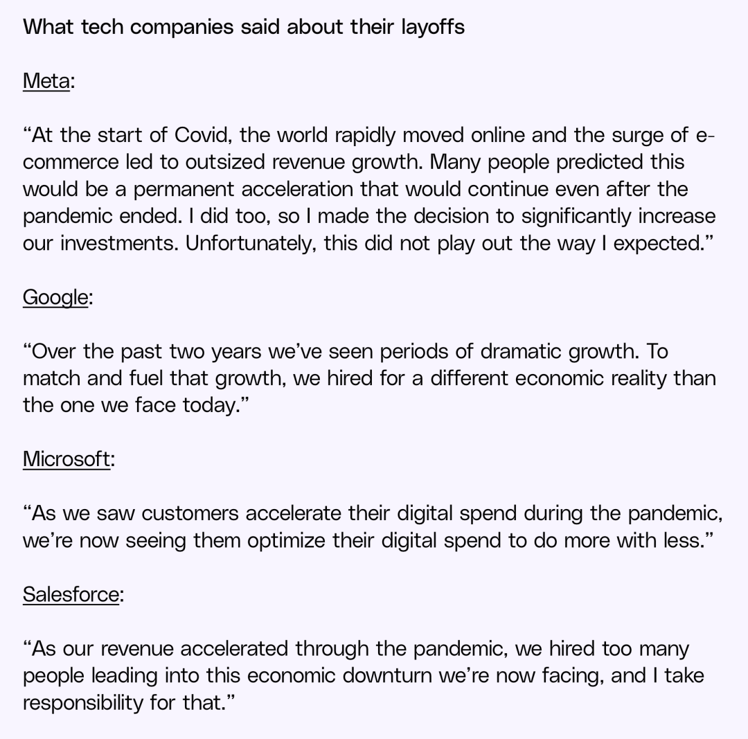 但「搞错」的,显然不只是扎克伯格与 Meta 一家:截至 2023 年 1 月,几乎所有硅谷耳熟能详的科技巨头都宣布了自己的裁员计划,且公开信内容结构都高度雷同,一致到甚至会让人以为这些巨头的内部公开信都是出自 ChatGPT 之手。