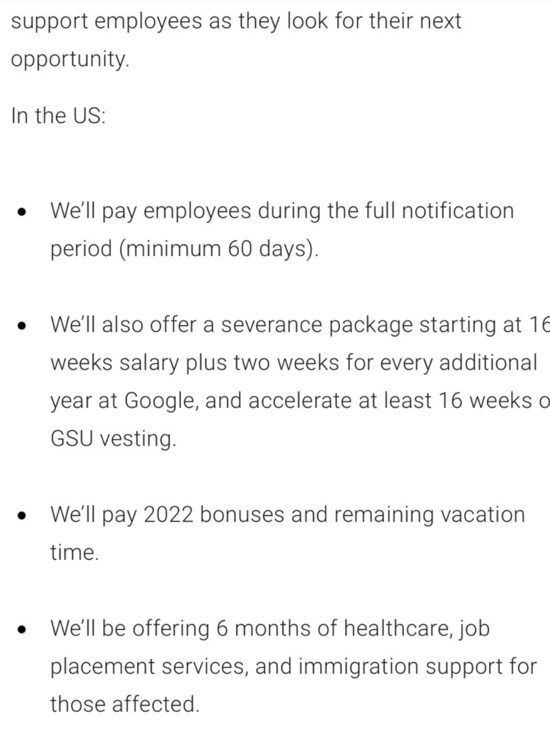 Meta、Google 除了在裁员通知期间为被裁员工提供全额薪资(至少 60 天)之外,还会额外发放一笔补偿金 —— 这笔补偿金起步为 16 周的薪水,也会随着工作年限的提升而上浮。同时员工接下来六个月的医疗支出,公司也会全额报销。