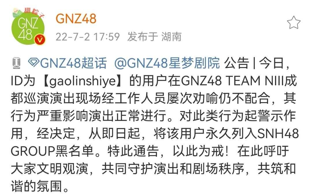 除了同样需要身份证实名检票外,还禁止携包进入,设有场控随时注意全场情况。如若在现场出现扰乱演出的观众,像是冲上舞台、骚扰成员等,则会被请出现场并公开用户ID且拉黑购买票券资格。就在7月2日,GNZ48星梦剧院便公示一位扰乱演出秩序的用户,以警示加列入剧院黑名单的强硬措施呼吁文明观演,守护演出和剧场秩序。