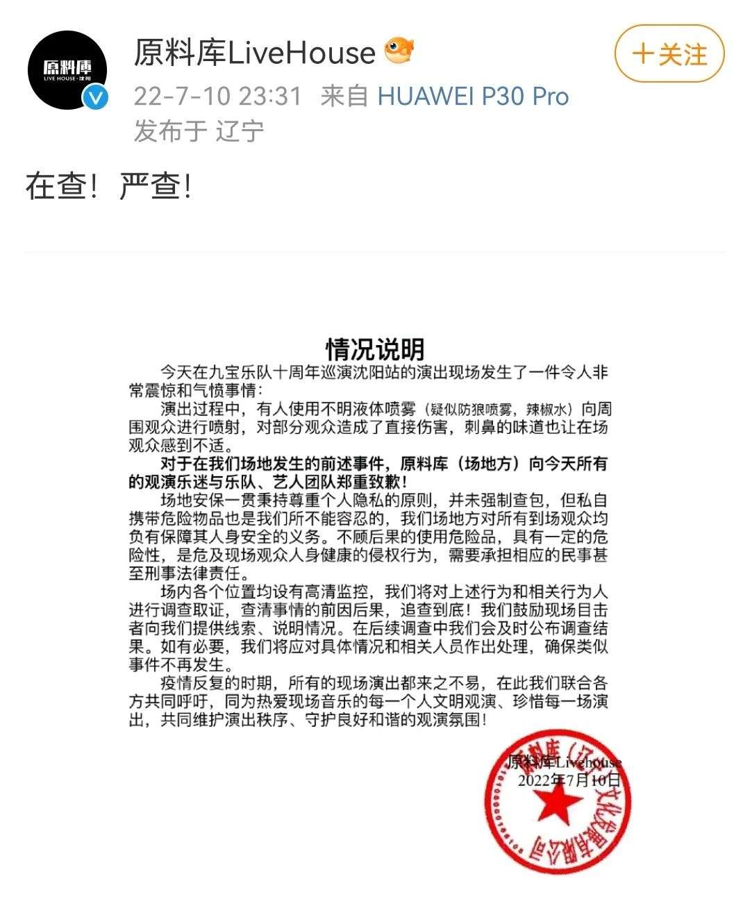 沈阳开演的九宝乐队,演出中途发生了台下无差别攻击事件。据场地方“原料库Livehouse”发布声明显示,九宝乐队演出时有人疑似不满Livehouse站位会有身体触碰,使用疑似防狼喷雾或辣椒水的不明液体向四周喷射,对部分观众造成了直接伤害,刺鼻的气味也令现场观众倍感不适。