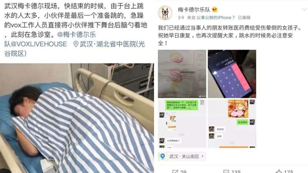 据报道,乐迷跳水也曾出现过安全事故。2019年3月9日,梅卡德尔乐队在武汉演出时,也有上演跳水的女生后脑勺着地,直接被送去急诊,乐队也出面负担了女生的医药费。