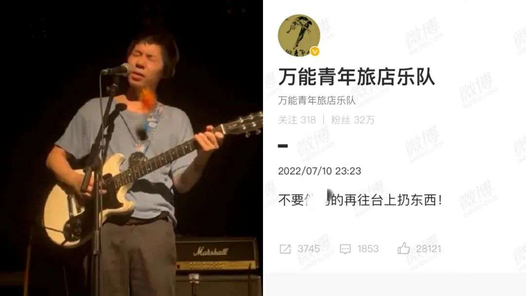 在太湖湾音乐节演出的万能青年旅店,在昨晚11点23分发博怒斥“不要TMD再往台上扔东西!”有在场乐迷表示,音乐节因恶劣天气被临时取消演出,有情绪激动的观众为发泄不满朝舞台扔矿泉水瓶,乐队鼓手不幸中招被砸晕,甚至还有观众现场放起冷焰,躺倒在台下拒绝离开。