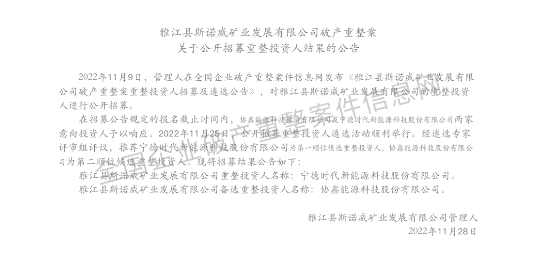 全国企业破产重整案件信息网显示,11月28日,斯诺威管理人宣布,经遴选专家评审组评议,宁德时代为第一顺位候选重整投资人,协鑫能科为第二顺位候选重整投资人。