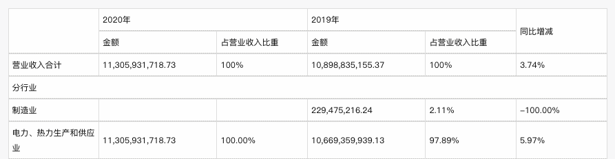 财报显示,2019年-2020年,协鑫能科“电力、热力生产和供应业”营收分别为106.69亿元以及113.06亿元,分别同比增长38.71%和5.97%。可以发现,重组的第二年,协鑫能科的新业务增速就下跌到了个位数。