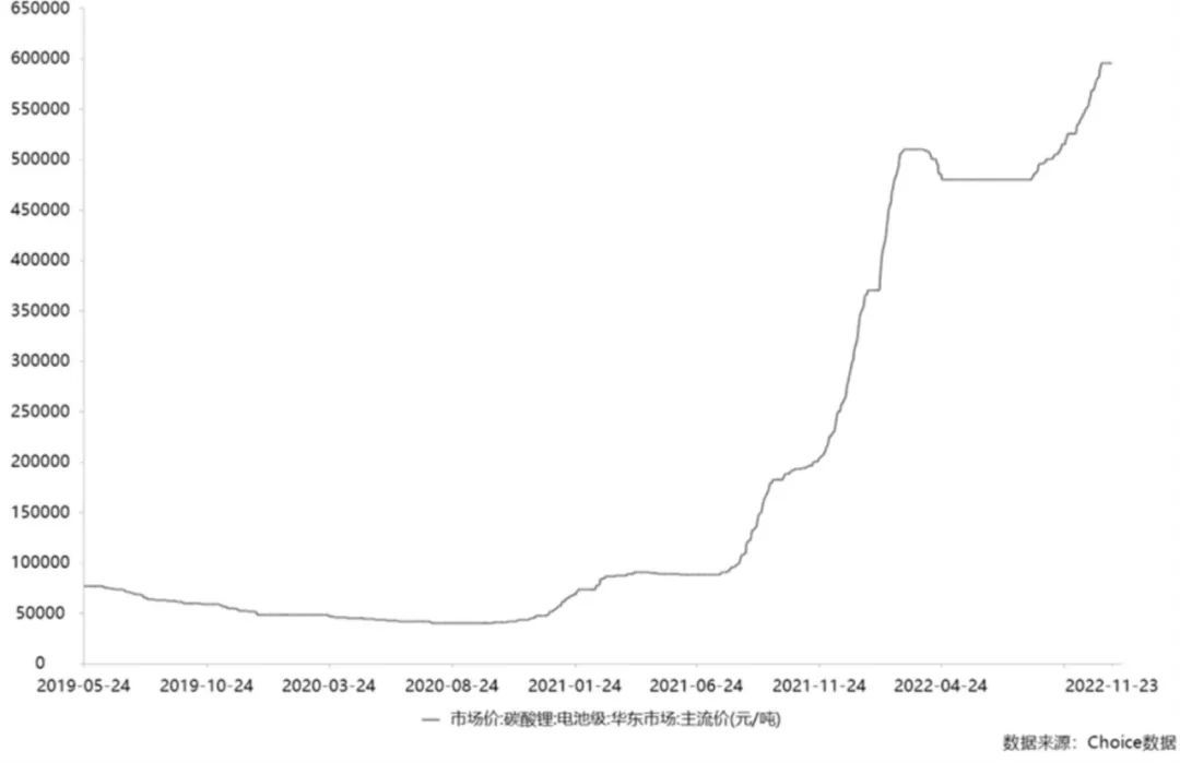 众所周知,目前主流的储能设备以锂电池为主,新能源汽车的持续热销,也直接带动锂元素的价格上涨。Choice数据显示,目前原材料碳酸锂的价格为60万/吨左右,作为对比,2019年这一数字仅为5万/吨左右,三年时间翻了六倍。