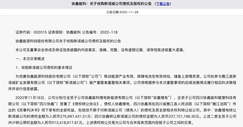 2022年11月28日,协鑫能科(002015.SZ)发布公告称,为完善移动能源产业布局,保障电池包有效供给,储备上游锂资源,公司拟参与雅江县斯诺威矿业发展有限公司(简称为“斯诺威”)破产重整案重整相关事项。