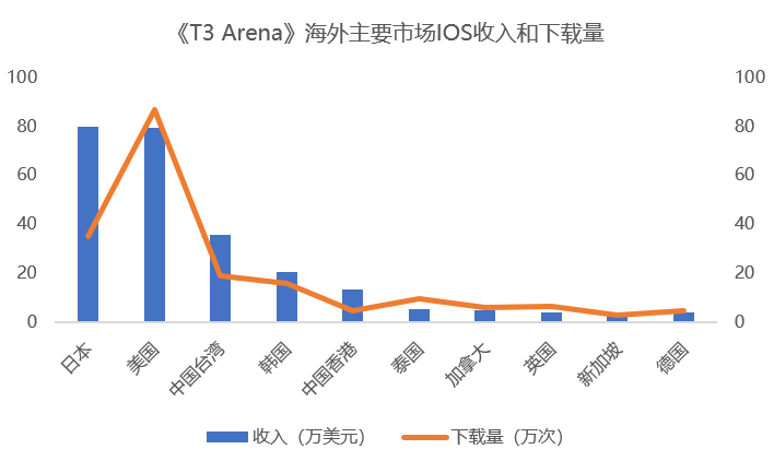《T3 Arena》收入分布更为均衡,日本、美国和中国台湾是收入前三大市场,合计贡献近8成收入。
