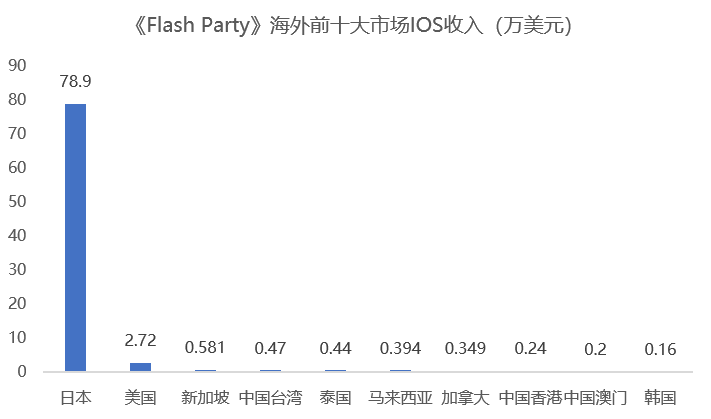 其中,平台格斗游戏《Flash Party》于今年2月在海外市场上线,前十大市场累计收入约84.5万美元(折合约570.5万人民币),累计下载量约176.8万次。日本单一市场贡献9成以上收入。