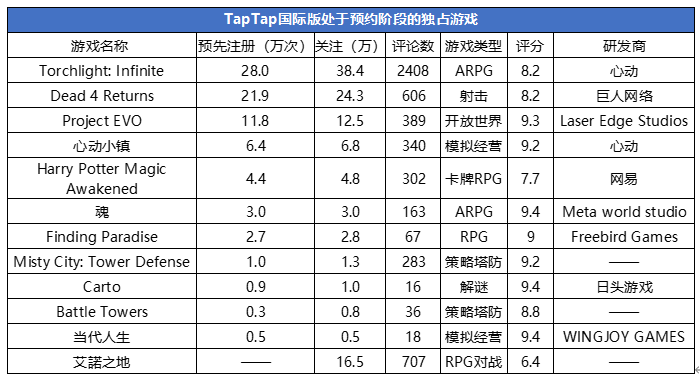 据游戏财经汇不完全统计,目前TapTap国际版共有不到40款独占游戏,其中一半以上处于测试或预约阶段,正式上线的独占游戏只有10余款(此处统计的独占游戏不包含独占期结束或下架、停服的游戏)。