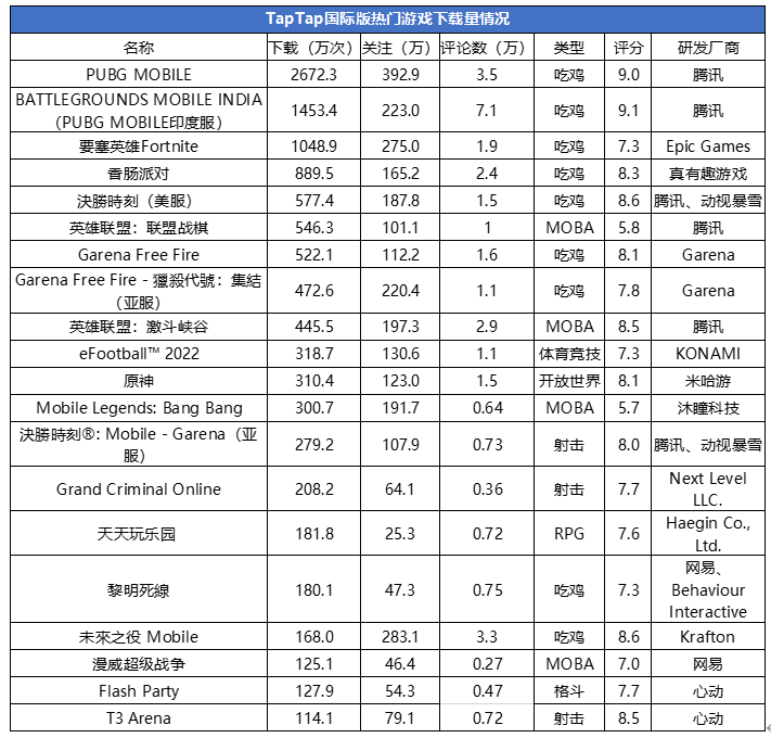 1、TapTap国际版现状:热门吃鸡类手游贡献大部分下载量