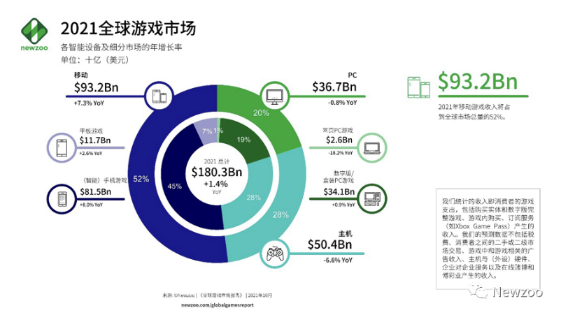 从用户增长来看,移动游戏市场增长潜力更大。2021年全球移动游戏收入达到932亿元,占比超过一半。Newzoo报告显示,PC、主机游戏增长出现滞缓,移动游戏成为推动全球游戏市场持续增长的唯一驱动力。